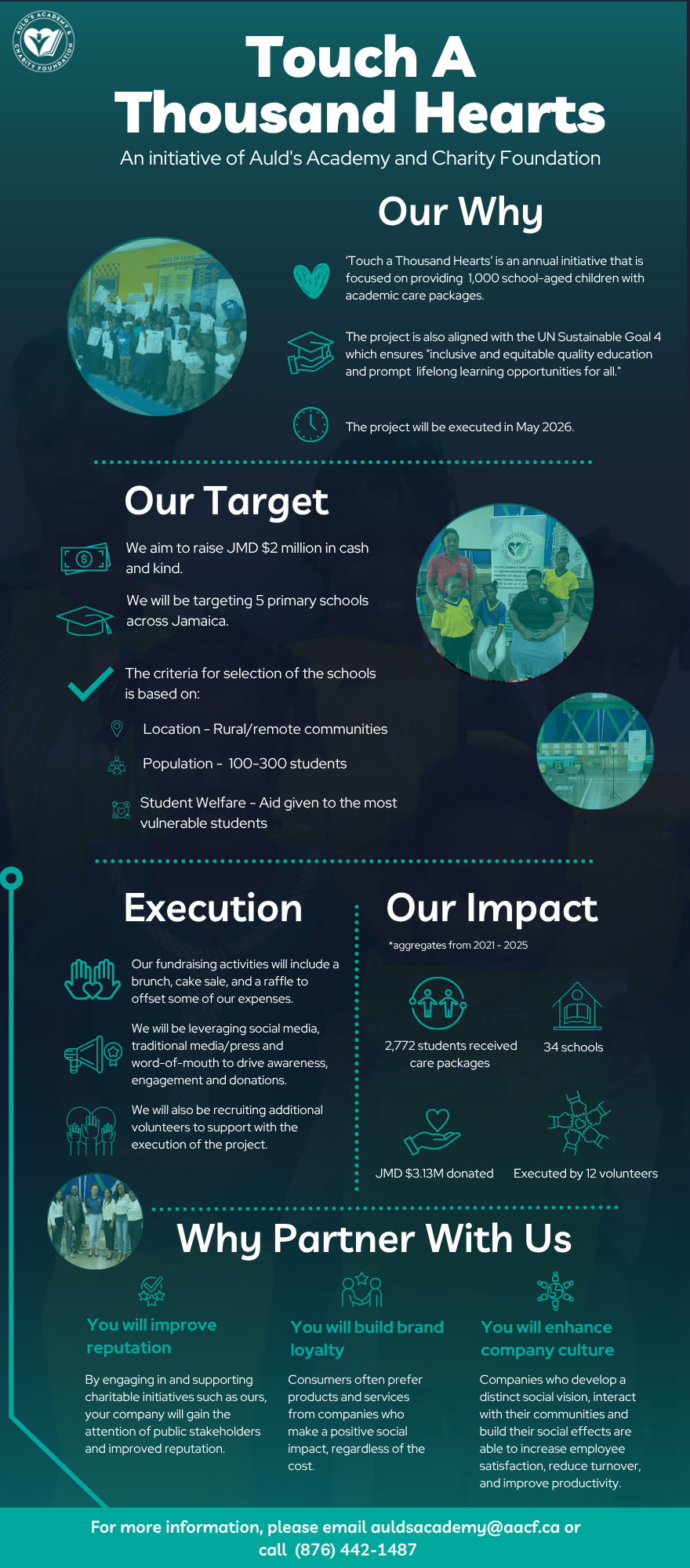 Donate to our initiatives and help us to make a difference in children's lives. If you would like to donate to cash or school supplies, our foundation's banking information is provided below or you may use the following link https://partners.givingtuesday.ca/partners/aulds-academy-and-charity-foundation or you can call us at 1-876-442-1487 to donate in kind.